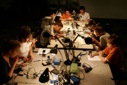 Beim Löten und Bauen werden Kompetenzen im Ungang mit Mikroelektronik erworben und auf der Basis des Bausatzes selbst erfundene Spiele zusammengelötet und programmiert.
