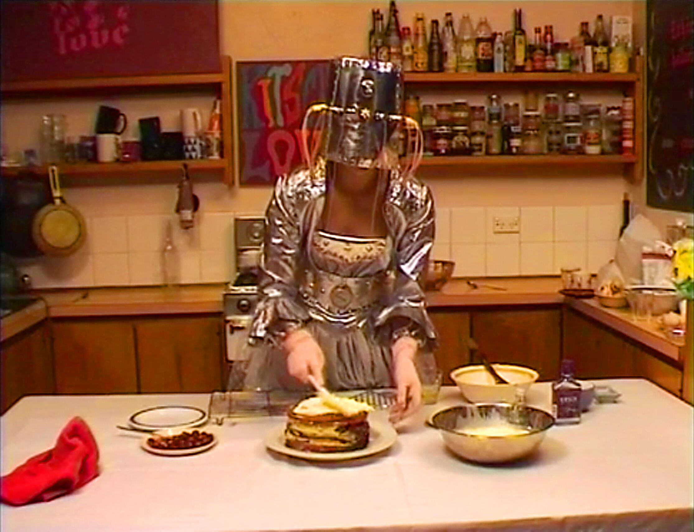 Videostill aus Suzanne Treister, Rosalind Brodsky's Time Travelling Cookery TV Show Episode 1 – Pierogi, 1998, 07:00 Min., Video, Farbe, Ton. Courtesy of the artist